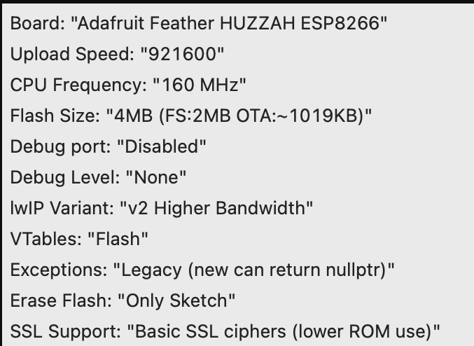 아두이노에서 Open Tools > Board > ESP8266을 선택 Adafruit Feather Huzzah ESP8266 을 선택합니다.